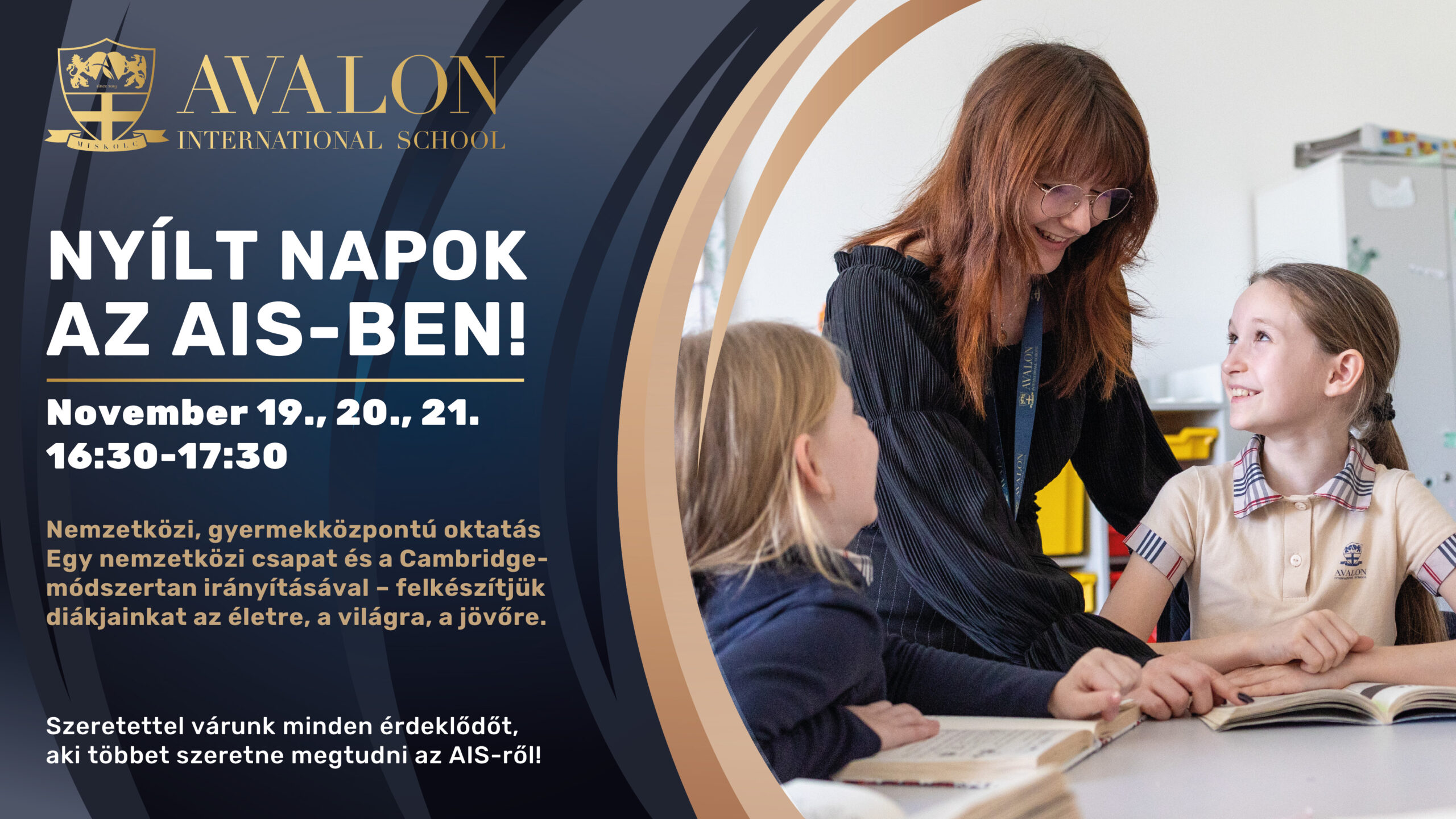 Az AVALON Nemzetközi Iskola Alapítvány által működtetett Avalon International School (AIS) az első Cambridge-i rendszerre épülő magániskola Miskolcon és térségében. A 2019 szeptemberében nyílt iskola és óvoda mintegy 5000 négyzetméteren biztosít színvonalas nevelési, valamint oktatási lehetőséget. A 3 és 5 évesek az óvodai oktatásunk és nevelői munkák részesei, míg 6 éves kortól pedig már a Cambridge International által akkreditált Cambridge-i módszer szerint tanulhatnak diákjaink az iskolai részlegünkön. Az Avalon Nemzetközi Iskola legfőbb célkitűzése, hogy olyan közösséget alakítson ki, amelyben minden egyes diákunk külön egyéni figyelemben részesül, melyben fejleszteni tudjuk készségeiket, tehetségüket, hogy szárnyalni tudjanak, illetve melyben teljes mértékben támogatást kapnak tőlünk, hogy felelősségteljes nemzetközi gondolkodásmóddal rendelkező fiatalokká váljanak. Az AIS épülete és felszereltsége maximálisan tükrözi az iskola által képviselt értékeket és megfelel a 21. század esztétikai és technikai elvárásainak, legyen szó akár digitális formában alkalmazható oktatási felületekről, applikációkról.